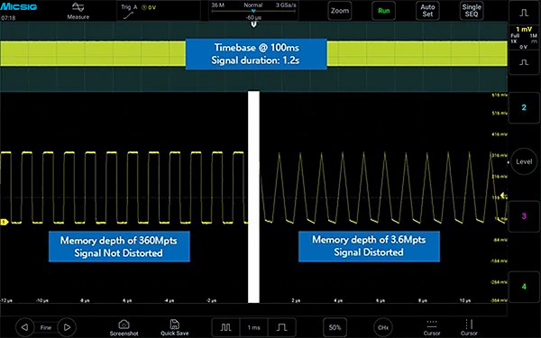 Con una profundidad de memoria de 360Mpts, incluso cuando dos canales están activos simultáneamente, no hay reducción en la capacidad de almacenamiento, lo que garantiza una excelente fidelidad de la señal en grandes bases de tiempo.