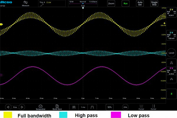 El filtrado digital de hardware puede pasar o bloquear selectivamente componentes de señal dentro de intervalos de frecuencias específicos, lo que es muy útil para analizar bandas de frecuencia específicas de una señal o observar cambios en componentes de frecuencia específicos.